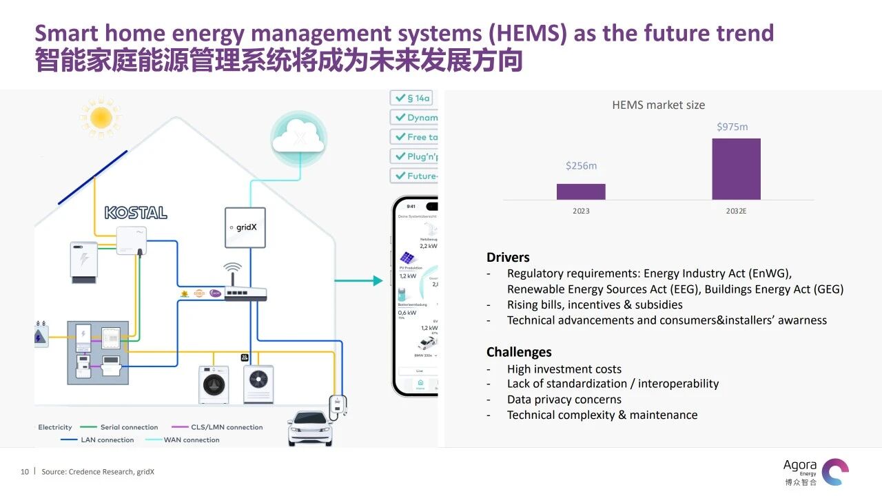 博众智合能源转型中国电力项目咨询师邹以宁聚焦德国建筑领域的分布式能源发展与市场前景。她介绍到,德国电力系统正向去中心化网络演进,目前德国已部署超过300万户的户用光伏、190万台热泵、约160万辆电动汽车,80%以上的电池储能由家庭安装。在这种背景下,智能家庭能源管理系统(HEMS)将成为重要发展方向——HEMS可协调屋顶光伏、家庭储能、热泵与电动汽车,优化能量流、信息流和价值流,提升系统效率并促进居民端参与电力与热力的灵活调节。面向未来,市场化机制、数字化赋能与国际合作将进一步加速建筑领域的绿色转型。